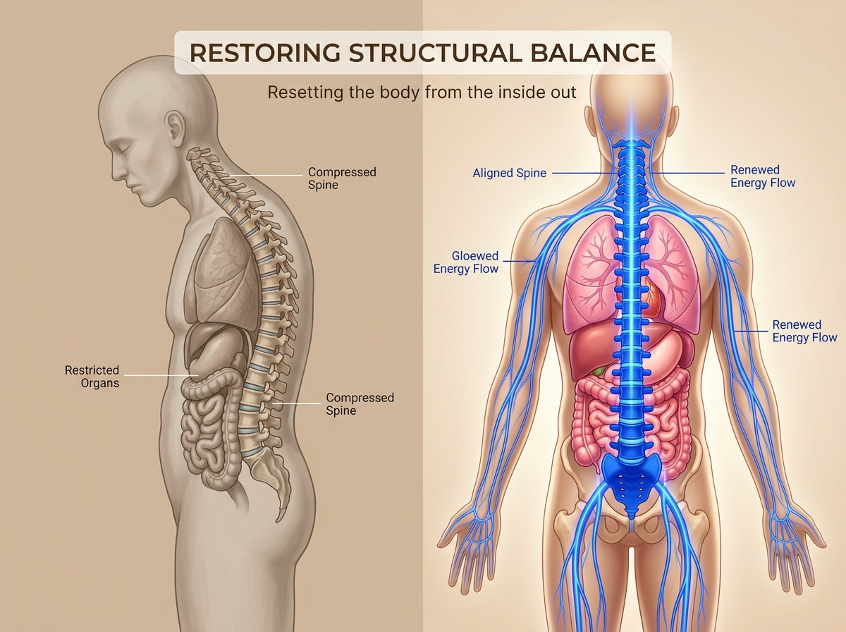 Spinal Misalignment: Structural shifts that go beyond muscle pain, often compressing internal organs and affecting overall metabolic health.