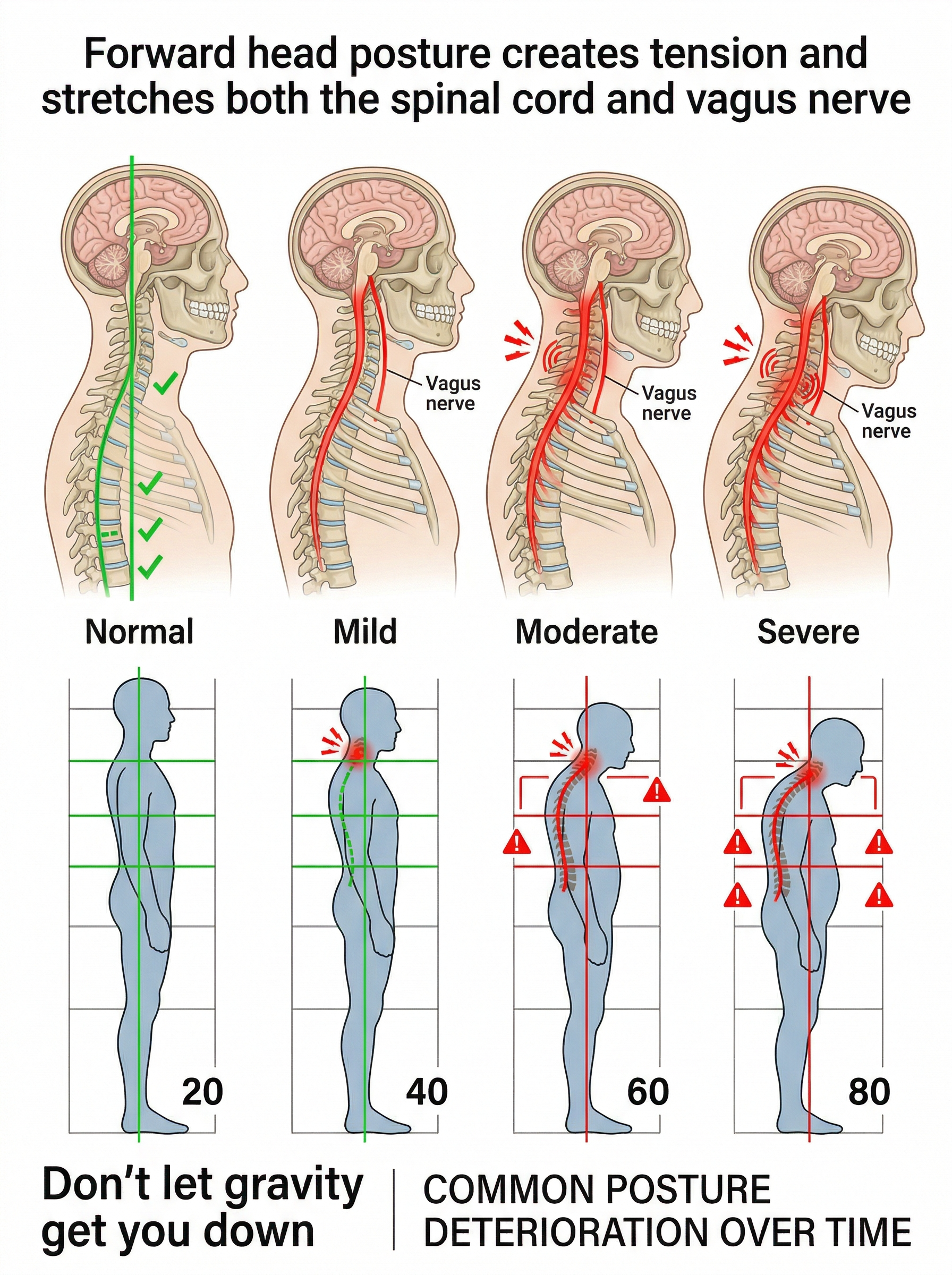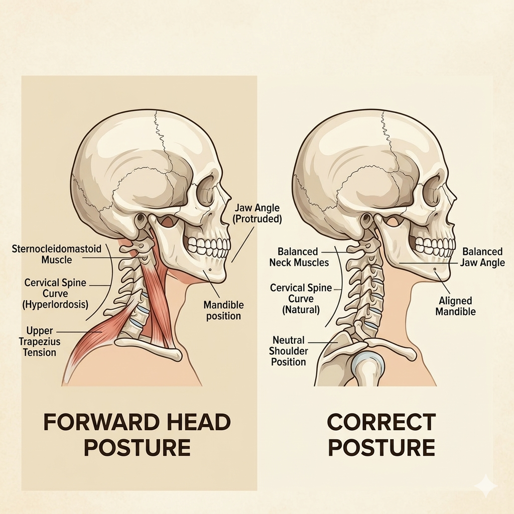 Forward Head Posture: Your head shifts forward, creating massive mechanical stress on the neck and upper back.